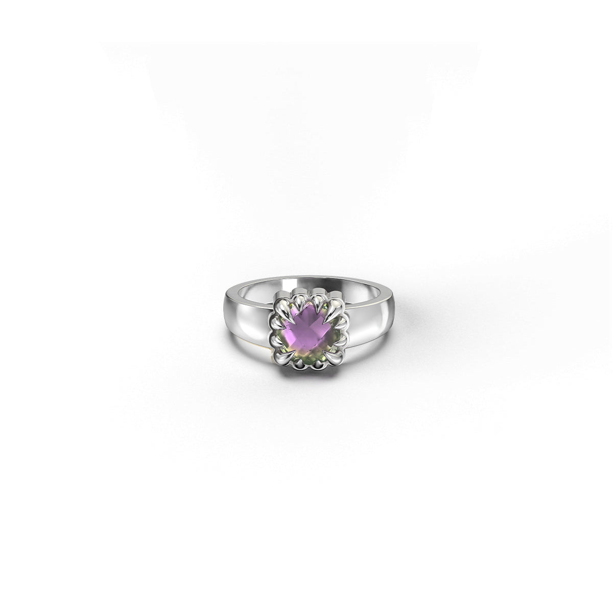 The heart-cut quartz reveals shifting flashes of violet, green and rose as it moves through the light, while the sharp claw tips amplify the stone’s brilliance and give the ring its distinctive edge.
