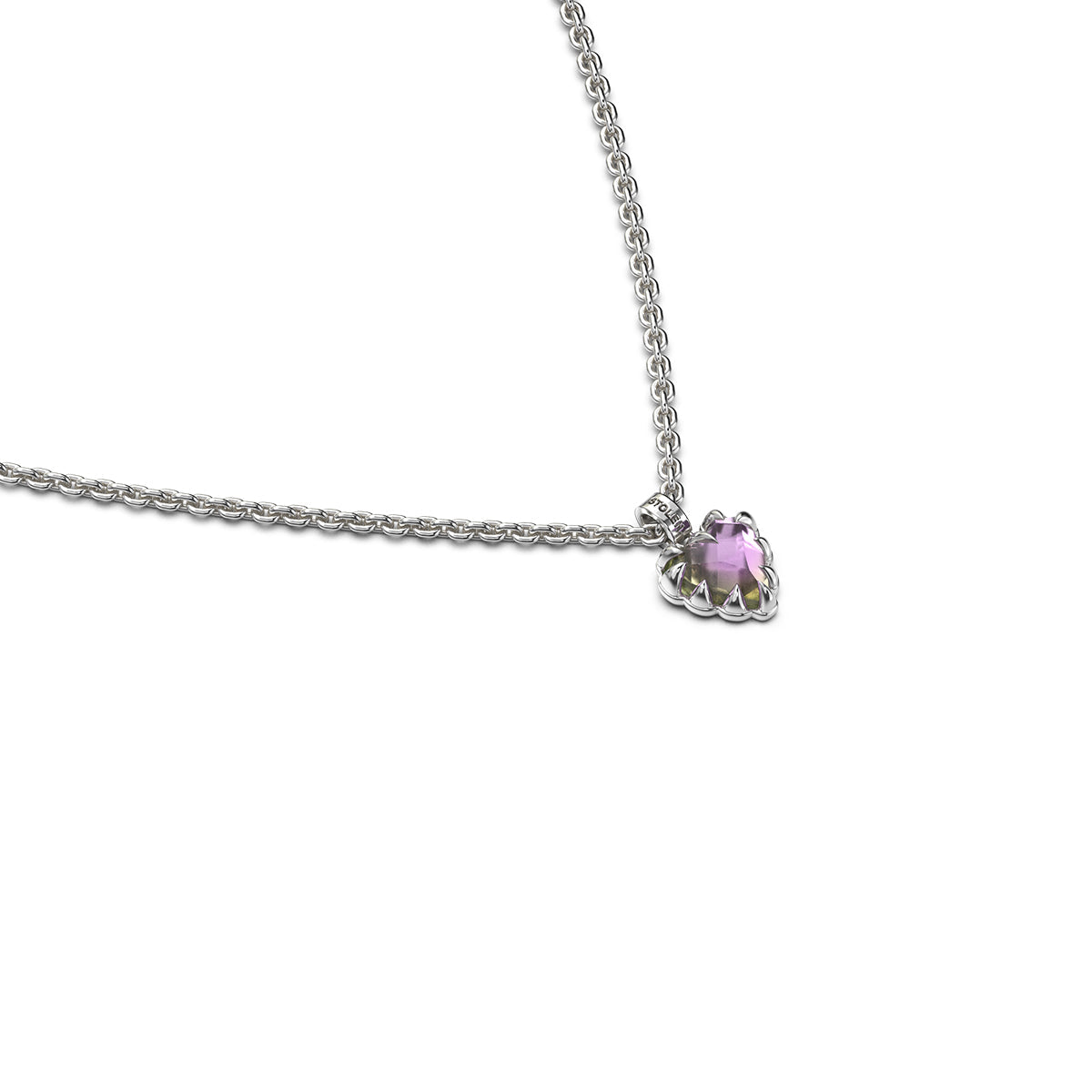 The Mini Love Claw Necklace refines our signature claw architecture into a compact pendant form. A square-cut mystic quartz — selected for its distinctive violet-to-green tonal shift — is secured within sculptural claw settings that frame the stone with precision and tension.