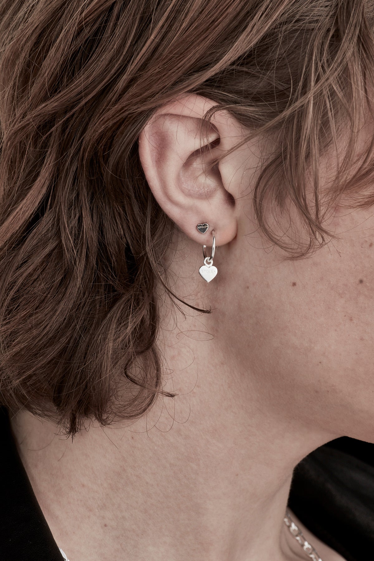 Our Stolen Heart Anchor Sleepers are crafted from solid sterling silver with a high polish finish. This pair of beautiful drop earrings feature delicate mini heart charms with hallmark logos, suspended on our classic anchor hoops.